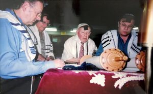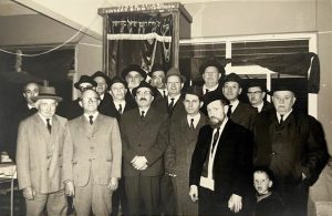 ועד בית הכנסת עם מתפללים נוספים בתמונה לפני ארון הקודש